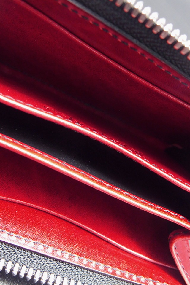 インナーはベルギー伝統のレザー、ルガトショルダーのカーディナルレッドを採用。艶やかな発色と、そこに浮かび上がるトラの縞模様がこの革の特徴です。通常は、表側に使用する高級レザーですが、内張に使用。贅沢な仕様となっております。