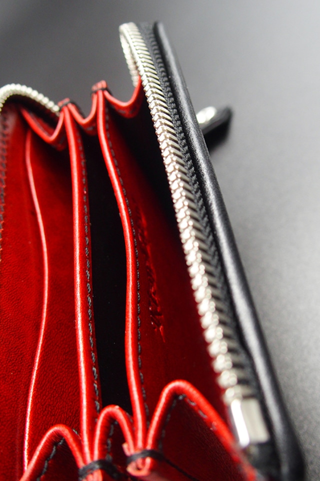 ウォレットの畳んだ時と開けたときにのぞく、ルガトのレッドがよいアクセントになっております。クロコダイルのBLACKが際立ちます。