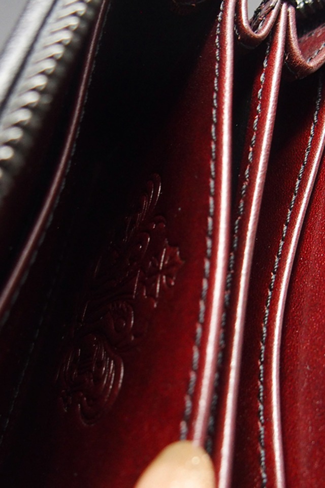 インナーはベルギー伝統のレザー、ルガトショルダーのバーガンディを採用。外装のポロサスと相性抜群です。艶やかな発色と、そこに浮かび上がるトラの縞模様がこの革の特徴です。
