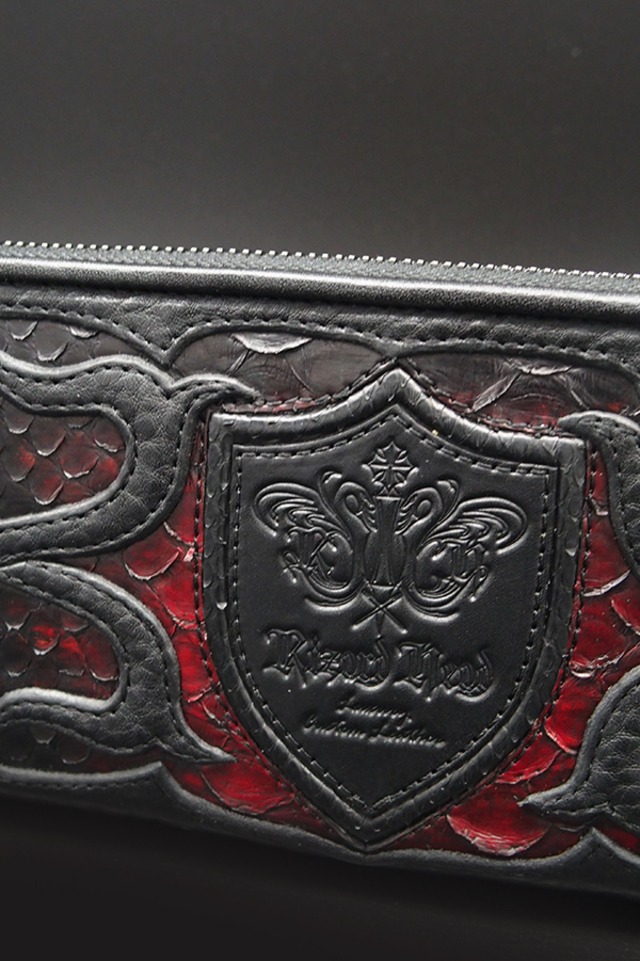 フロントは、工房にて手染めで仕上げられたダイヤモンドパイソンをチョイスしました。全て手作業でレッド&ブラックの染色を施したダイヤモンドパイソンは同じデザインでも二つとして、同じ表情をした作品はないオンリーワンアイテムです。